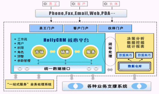 更關(guān)鍵是,HOLLYCRM(合力金橋軟件)的CRM不是單純的、簡(jiǎn)單的客戶管理產(chǎn)品,它是一套完整的解決方案,覆蓋了協(xié)作型、運(yùn)營(yíng)型和分析型的全部范疇,其結(jié)構(gòu)框架見(jiàn)圖,其核心平臺(tái)涉及到市場(chǎng)、銷(xiāo)售、服務(wù)等多個(gè)環(huán)節(jié),并通過(guò)數(shù)據(jù)集市或者數(shù)據(jù)倉(cāng)庫(kù)的形式,提供數(shù)據(jù)挖掘、決策分析等服務(wù)。最關(guān)鍵的是,HOLLYCRM(合力金橋軟件)在提供解決方案外,還不斷提升管理和咨詢能力,和一些咨詢公司合作,將咨詢和產(chǎn)品作為一個(gè)整合的方案提供給用戶,并提供360度的系統(tǒng)咨詢、設(shè)計(jì)和實(shí)施、維護(hù)服務(wù)。