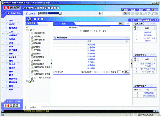 | 業(yè)務咨詢:快速查詢知識點,定位相關(guān)業(yè)務信息解答客戶。支持“關(guān)鍵字”、“個性化編碼”、“全文檢索”、“熱點排行”、“個人收藏夾”等多種信息查詢方式。 |