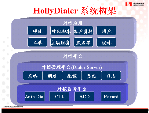 HollyDialer是HOLLYCRM(合力金橋軟件)公司自主開發(fā)的外撥業(yè)務綜合平臺,作為HollyC6呼叫中心系統(tǒng)的增值軟件,HollyDialer主要圍繞客戶實現(xiàn)相關(guān)的主動服務,完成市場調(diào)查、客戶回訪、電話營銷等多種類型的外撥任務。外撥設(shè)備支持多種主流交換平臺的無縫集成,能夠靈活定制自動、人工外撥策略,實現(xiàn)預覽式、預測式、多種智能外撥模式,為企業(yè)建設(shè)盈利型的呼叫中心提供了最為便捷的工具,