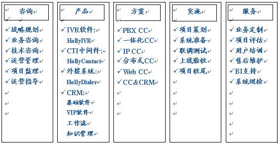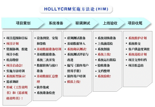 HOLLYCRM(合力金橋軟件)公司是國內(nèi)最早從事呼叫中心應用軟件開發(fā)與服務公司,在多年的實踐經(jīng)驗基礎(chǔ)上形成了完整的“456”呼叫中心“項目實施方法論”(HIM:HOLLYCRM Implementary Methodology),即“四大實施策略、五個項目階段、六大管理專題”。該體系的有效運行對公司項目的成功上線和推進軟件產(chǎn)品的成熟將起到至關(guān)重要的作用。
