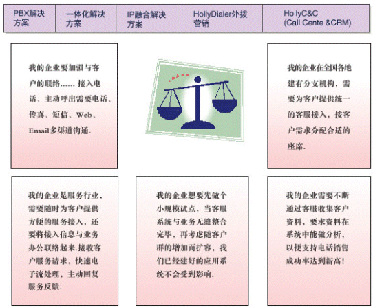 HollyC&C不僅支持電話、傳真、短信、Email、Web多媒體溝通渠道的統(tǒng)一接入和管理,還具有強大的業(yè)務整合接口,能夠幫助企業(yè)實現(xiàn)呼叫中心與企業(yè)其它信息系統(tǒng):如辦公OA、ERP、SCM、財務等系統(tǒng)的接口和工作流程整合。