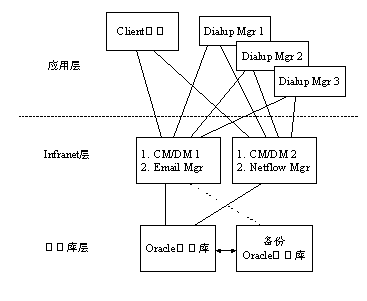 硬件平臺呈3層結(jié)構(gòu),分別為應(yīng)用層、Infranet計(jì)費(fèi)和用戶管理層以及數(shù)據(jù)庫層。