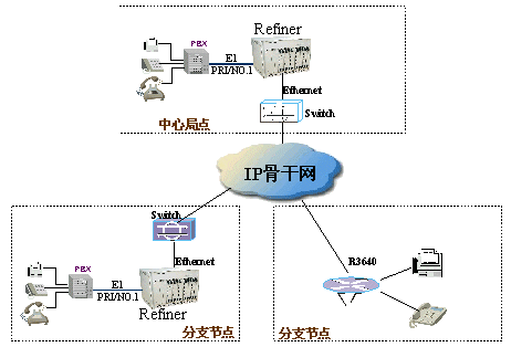 對于大多數(shù)的企業(yè)用戶,都擁有自己的用戶交換機PBX。在進行IP電話網(wǎng)的建設中,這些PBX將被保留,繼續(xù)承擔起用戶接入的功能。而這些PBX之間的中繼連接都將通過IP骨干網(wǎng)來完成。這樣,既可以節(jié)約價格不菲的長途中繼租用費,也避免了大規(guī)模的改造所帶來的浪費。
