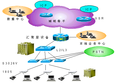 在用戶(hù)接入層Quidway S3026V提供24路VDSL接入,在普通雙絞線上提供12Mbps的雙向?qū)ΨQ(chēng)數(shù)據(jù)業(yè)務(wù),傳輸距離最大可達(dá)1500m,在完成以太網(wǎng)接入的同時(shí),不影響POTS業(yè)務(wù)。S3026V上行FE接口直接接入L3交換機(jī)。同時(shí),通過(guò)雙絞用戶(hù)線完成了與PSTN交換機(jī)的相連,將寬帶、窄帶業(yè)務(wù)在S3026V上匯合,并通過(guò)已有雙絞電話(huà)線連接至遠(yuǎn)端用戶(hù)設(shè)備(1805)。1805可以通過(guò)五類(lèi)線與計(jì)算機(jī)網(wǎng)卡相連。