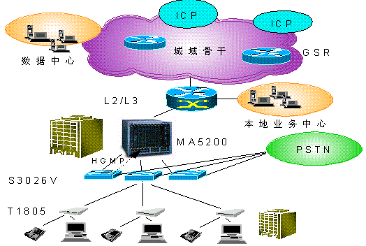另外,Quidway S3026V可與華為公司MA5200等組網(wǎng),通過(guò)HGMP(Huawei Group Management Protocal)華為組管理協(xié)議,S3026V與華為MA5200、S3526等上行管理設(shè)備共同提供寬帶接入網(wǎng)的整網(wǎng)解決方案,實(shí)現(xiàn)對(duì)Quidway(R) S3026V的集中管理,為用戶(hù)提供更廣泛、更豐富的業(yè)務(wù)功能,充分體現(xiàn)華為公司在寬帶網(wǎng)絡(luò)上具有的“可運(yùn)營(yíng)、可管理、可維護(hù)”優(yōu)勢(shì)。 如圖2所示: