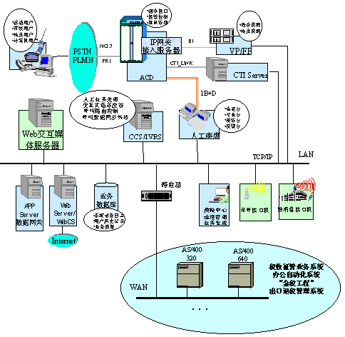 在深圳國稅局方案中,整個系統(tǒng)的建設(shè)按三期規(guī)劃進(jìn)行。第一期的目標(biāo)主要是搭建呼叫中心平臺,包括ACD(排隊機(jī))、IVR(交互式語音應(yīng)答系統(tǒng))、CCS(華為呼叫中心中間件)等軟硬件設(shè)備。ACD作為整個系統(tǒng)的核心接入設(shè)備,采用了華為公司的C&C08-Q排隊機(jī)。C&C08-Q是大容量高可靠性的數(shù)字排隊機(jī),通過中國七號信令或ISDN