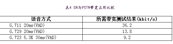 為進(jìn)一步節(jié)省帶寬,又采用語(yǔ)音激活檢測(cè)技術(shù)(VAD)及舒適噪音生成(CNG)技術(shù),VAD技術(shù)只有當(dāng)檢測(cè)到語(yǔ)音處于活動(dòng)狀態(tài)時(shí),編碼器的輸出信號(hào)才被送到網(wǎng)絡(luò)上,因此節(jié)省了帶寬。而在靜音時(shí)段采用CNG技術(shù),生成與背景噪聲相匹配的較舒適的靜音,避免了用戶(hù)有不自然的交談感覺(jué),保證通話質(zhì)量。實(shí)際測(cè)試結(jié)果如表4,采用G.72920ms打包+VAD技術(shù)節(jié)省了近75%的帶寬。