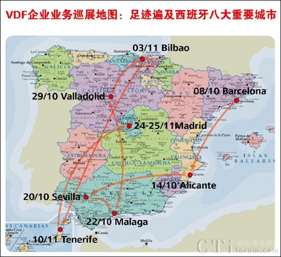 Vodafone 09企業(yè)業(yè)務巡展是Vodafone攜手10家重要合作伙伴和28家SP針對西班牙企業(yè)用戶舉行的一個大型巡展,整個展會歷時兩個月,以西班牙的經(jīng)濟文化中心Barcelona為起點,途徑Alicante、Sevilla、Malaga、Valladolid、Bilbao、Tenerife,最后于11月24-25號在西班牙首府Madrid隆重謝幕。共有1萬多人、五千多家企業(yè)參加了本次展會,受邀企業(yè)覆蓋到金融、貿易、電信、交通、建筑、服務、醫(yī)療保健等重要行業(yè),其中大都為移動辦公需求旺盛需要保持實時協(xié)同的中小型企業(yè)。展會期間,華為歐洲地區(qū)部多位高層領導親臨展會現(xiàn)場指導工作,包括Vodafone系統(tǒng)部副總Edward Chan和張文林、代表處代表謝新平、歐洲軟件業(yè)務部領導林劼。領導們和客戶親切交流,并廣泛了解了其他SP展出的多項創(chuàng)新業(yè)務。