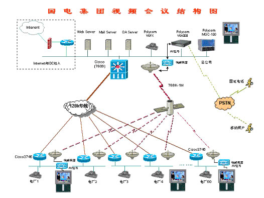 128,集團下屬60個電廠均采用視頻終端ViewStation 128。整個網(wǎng)絡采用Polycom MCU的混速功能,在本部中心采用768Kbps進行視頻傳輸,和下屬60個電廠及分公司采用128Kbps進行傳輸。由于網(wǎng)絡傳輸線路分為衛(wèi)星線路和地面有線網(wǎng)絡,衛(wèi)星線路帶寬為768Kbps-1Mbps,用于業(yè)務下行線路,地面有線網(wǎng)絡128Kbps用于視頻回傳。根據(jù)網(wǎng)絡傳輸線路的實際情況,在本部中心利用1臺視頻終端將其模擬信號(AV信號)送到衛(wèi)星端接設備(包含MODEM,編解碼器等),將模擬信號轉換成數(shù)字信號(MPEG4),利用768K-1Mbps衛(wèi)星線路廣播到每個接收點,通過每個接收點的編解碼器將數(shù)字信號轉換成模擬信號連接到顯示終端(如TV、顯示器)上進行收看,通過這種方式可以實現(xiàn)利用衛(wèi)星線路的高帶寬,并利用其廣播特性,節(jié)省投資。