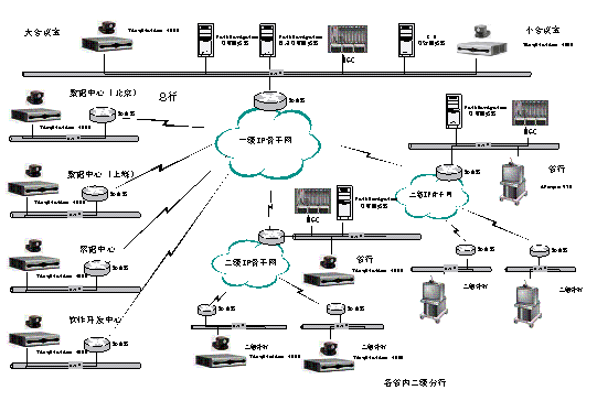 中國工商銀行此前已具備覆蓋一級分支機構(gòu)的衛(wèi)星視頻會議系統(tǒng)和部分基于TCP/IP網(wǎng)絡(luò)的二級分支機構(gòu)的H.323視頻會議系統(tǒng),并在此網(wǎng)絡(luò)中使用了包括寶利通在內(nèi)的多家廠商的產(chǎn)品。但是,隨著機構(gòu)業(yè)務(wù)的不斷擴大,原有系統(tǒng)已無法滿足目前的需要。而網(wǎng)絡(luò)技術(shù)的快速發(fā)展,使地面通訊線路的使用成本大幅降低,地面網(wǎng)絡(luò)的穩(wěn)定性、易維護性、帶寬可擴充性也使視頻會議系統(tǒng)的傳輸由傳統(tǒng)的較昂貴的衛(wèi)星專用信道轉(zhuǎn)向地面TCP/IP網(wǎng)絡(luò)成為大勢所趨。因此,工行決定在全行范圍內(nèi)替換原有H.320視頻會議系統(tǒng),神州數(shù)碼應(yīng)用網(wǎng)絡(luò)事業(yè)部基于中國工商銀行視頻會議系統(tǒng)特點采用TCP/IP網(wǎng)絡(luò)的H.323視頻會議系統(tǒng)。