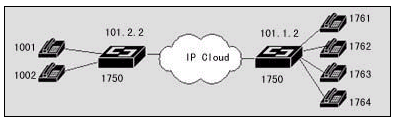 在該案例中,異地之間通過兩臺DCR 1750互連,并提供語音模塊,可直接接電話機,使得異地之間可以通過IP網(wǎng)絡撥打IP語音電話。