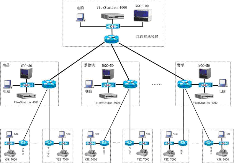 江西省地方稅務局是主管地方稅收的省人民政府直屬機構(gòu)。內(nèi)設辦公室、政策法規(guī)處、人事處、流轉(zhuǎn)稅管理處,等10個職能處(室)。全系統(tǒng)共有機構(gòu)1193個,其中省局1個,設區(qū)市局11個,縣(市、區(qū))級地稅局(分局)115個,基層分局(所)625個,事業(yè)單位333個,直屬單位108個。長期以來省局與下屬各部門之間聯(lián)系不便,每年都需要頻繁召開省局與下屬分局的大小會議來進行工作部署、交流以及統(tǒng)一的學習、培訓等等,不僅消耗了大量的時間,也耗費了很多的人力和物力。因此急需建立起一個完善的、功能強大的視頻會議系統(tǒng)。該系統(tǒng)建成后,應實現(xiàn)以省局為中心連通下屬各個市、分局,以市、分局為中心,向下聯(lián)通各自所轄基層分局,實現(xiàn)全省稅務機關的遠程電視會議、遠程培訓、視頻檔案等功能。