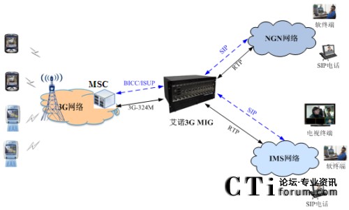 下圖所示為3G網(wǎng)絡(luò)視頻互聯(lián)的典型組網(wǎng)解決方案。3G側(cè)信令可以采用ISUP/TDM的方式連接到艾諾3G MIG,媒體采用 3G-324M/TDM的方式連接。3G側(cè)也可以信令采用BICC/IP,媒體采用3G-324M/NbUP的方式連接到3G MIG上。而NGN/IMS側(cè)信令采用SIP,媒體采用RTP 方式進(jìn)行連接。艾諾3G MIG支持BICC/ISUP混合接入,以及同時接入NGN和IMS網(wǎng)絡(luò)。