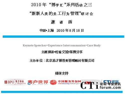 21世紀(jì)什么是貴?人才最貴!人才是企業(yè)持續(xù)發(fā)展的唯一生命之源。易才博普奧公司(CTG BPO)作為專業(yè)的人力資源外包專家、服務(wù)外包產(chǎn)業(yè)專業(yè)人才租賃供應(yīng)商,近年來(lái)在業(yè)界積累了大量?jī)?yōu)秀的一線人才租賃經(jīng)驗(yàn)并得到廣泛的業(yè)界好評(píng)!2010年伊始,易才博普奧推出了“博學(xué)匯”系列客戶交流會(huì)活動(dòng),旨在搭建一個(gè)與行業(yè)精英、業(yè)內(nèi)專家互動(dòng)交流的平臺(tái),學(xué)習(xí)、體驗(yàn)和分享多元文化,促進(jìn)和推動(dòng)彼此之間的交流與合作。
