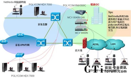 京東商城的NetMedia軟視頻會(huì)議MCU設(shè)備MCV8000N安裝在聯(lián)通的IDC,有10個(gè)倉(cāng)儲(chǔ)的網(wǎng)絡(luò)視頻會(huì)議室安裝硬件終端MCV2000N,另外40個(gè)倉(cāng)儲(chǔ)是在網(wǎng)絡(luò)視頻會(huì)議室的PC機(jī)上安裝一套NetMedia客戶(hù)端程序,各會(huì)議室終端通過(guò)ADSL撥號(hào)、3G無(wú)線上網(wǎng)、公司VPN專(zhuān)網(wǎng)等方式接入NetMedia軟視頻會(huì)議MCU。該系統(tǒng)以良好的網(wǎng)絡(luò)適應(yīng)性運(yùn)行在互聯(lián)網(wǎng)上,可保證音視頻低延時(shí)、高保真的交互,使各倉(cāng)儲(chǔ)間的技術(shù)交流和庫(kù)存數(shù)據(jù)交換常態(tài)化,為各地倉(cāng)儲(chǔ)間庫(kù)存數(shù)據(jù)交換、貨物調(diào)配提供了實(shí)時(shí)、快捷的溝通渠道。