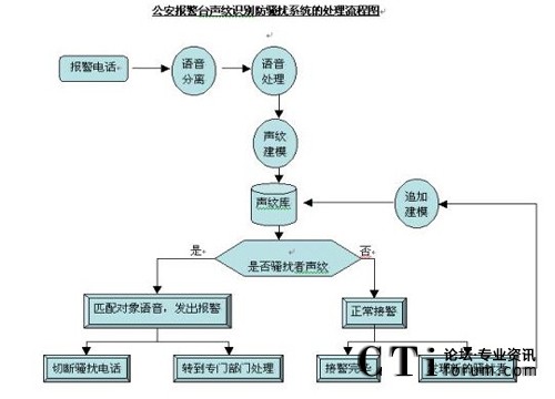 公安報(bào)警臺(tái)聲紋識(shí)別防騷擾系統(tǒng)的處理流程為:
