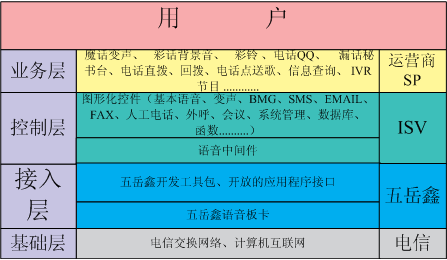 依靠五岳鑫公司強大的技術(shù)優(yōu)勢和對增值業(yè)務的深刻理解,以我公司自主研發(fā)的具有國際先進水平的語音板卡為基礎,為廣大增值業(yè)務服務商提供的語音增值業(yè)務綜合平臺,將種類繁多的語音增值業(yè)務融合在一個系統(tǒng)平臺中。不僅支持行業(yè)內(nèi)大多數(shù)的語音增值業(yè)務,還能方便、快速地面向市場提供各種的語音增值業(yè)務。