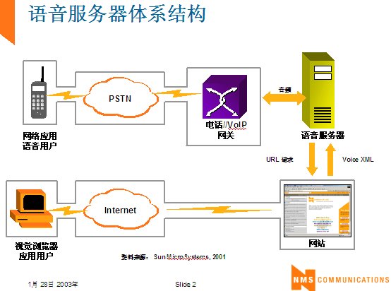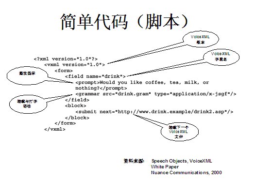 世界上最古老的用戶界面--人類語言終于在二十一世紀借助于VoiceXML,一種語音可擴展標記語言發(fā)展成熟起來。作為世界上第一個真正的語音通信標準,它定義了應(yīng)用開發(fā)商向用戶提供新型信息訪問服務(wù)的方式。通過這種服務(wù),用戶在任何地方,都可以通過電話或任何移動設(shè)備,虛擬訪問任何信息。VoiceXML正在被廣泛應(yīng)用于旅游、金融與信息服務(wù)等行業(yè)的各種業(yè)務(wù)領(lǐng)域中,甚至是政府部門與市政機構(gòu),全球的無線運營商等。