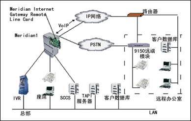 采用北電網(wǎng)絡(luò)的RemoteOffice解決方案。對于主叫用戶,與原來的撥號方案完全一樣;對于話務(wù)員座席,只是將交換機的數(shù)字座席通過廣域網(wǎng)或者專線方式連到遠(yuǎn)端。該方案在呼叫中心的PBX上安裝北電的Meridian