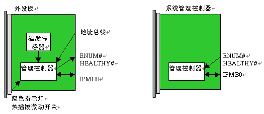 PICMG 2.9規(guī)范得到了進(jìn)一步的改善,增補(bǔ)了一份變更通知,解決了最初2.9規(guī)范中的一些缺陷。ECR致力于定義一種就軟件來(lái)說(shuō)與硬件無(wú)關(guān)的機(jī)制,這種機(jī)制能判別背板的容量以及哪個(gè)槽位已經(jīng)插入了CompactPCI單板。位于一個(gè)標(biāo)準(zhǔn)CompactPCI單板上的管理控制器可能會(huì)和地址總線、位于單板把手上熱插拔微動(dòng)開關(guān)、藍(lán)色的熱插拔燈、甚至是HEALTHY和ENUM#信號(hào)聯(lián)通。典型的系統(tǒng)管理控制器板與位于外設(shè)板上的管理控制器的聯(lián)接如下圖3所示: