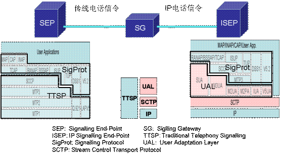 電話網(wǎng)中的一個信令節(jié)點與IP網(wǎng)中的一個信令節(jié)點不能直接相連,它們之間的相互通信需要依靠一個叫做信令網(wǎng)關(guān)(Signaling Gateway,SG)的中間設(shè)備來進行。從IP網(wǎng)絡(luò)的角度來看,這個信令網(wǎng)關(guān)有時也叫做應(yīng)用服務(wù)器通信設(shè)備,因為在UAL中常把上述的IP信令節(jié)點叫做應(yīng)用服務(wù)器(Application