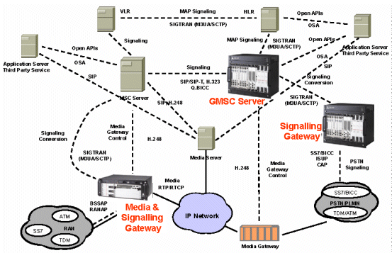 在這個例子中媒體和信令網(wǎng)關(guān)(Media & Signalling Gateway)、移動交換中心網(wǎng)關(guān)服務(wù)器(GMSC Server)、拜訪位置寄存器(VLR)、歸宿位置寄存器(HLR)都集成了信令網(wǎng)關(guān)的功能,它們分別起到無線接入網(wǎng)的信令網(wǎng)關(guān)和漫游信令網(wǎng)關(guān)的作用。獨立設(shè)置的信令網(wǎng)關(guān)(Signalling