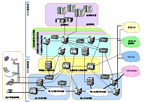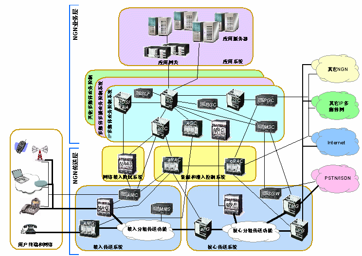 NGN是基于分組技術和多層網(wǎng)絡結構的未來電信網(wǎng)絡。它可支持所有可能的業(yè)務,包括使用各種媒體類型和轉播方式的、具有不同性能要求的業(yè)務。它的業(yè)務與傳送分離、控制與用戶數(shù)據(jù)處理分離的構架允許網(wǎng)絡中各個部件可分別配備和獨立發(fā)展。業(yè)務的提供采用具有開放接口的業(yè)務平臺,可以為第三方業(yè)務提供者所使用。傳送層采用可支持不同帶寬和端到端QoS能力的技術。NGN控制功能可分布于現(xiàn)有和新的網(wǎng)絡基礎設施上并可按組網(wǎng)的要求采用不同的組合形式。網(wǎng)關提供NGN不同域之間或NGN和現(xiàn)有網(wǎng)絡之間的互通。NGN支持通用移動性,使用戶或其他移動體無論其位置或技術環(huán)境的變化都能進行通信和接入業(yè)務。它允許用戶可以跨越不同的有線或無線接入技術,跨越現(xiàn)有網(wǎng)絡的界限使用他們的業(yè)務。| AGC Access Gateway Controller AMC Access Management Controller AMG Access Media Gateway AS Application Server BGC Breakout Gateway Controller MAG Multimedia Access Gateway MGC Media Gateway Control Function MGW Media Gateway MMS Mobility Management Subsystem MRC Multimedia Resource Controller MRP Multimedia Resource Processor NAAS Network Access Attachment Subsystem |