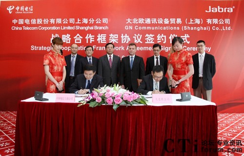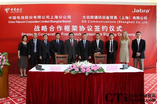 CTI論壇(ctiforum)6月23日消息(記者 楊佳林):上!蝾I(lǐng)先的創(chuàng)新耳麥解決方案提供商大北歐公司(GN Netcom)與中國電信上海公司(以下簡稱上海電信)今日隆重舉辦了 “戰(zhàn)略合作框架協(xié)議簽約儀式”。上海電信資深經(jīng)理花銳強(qiáng)、大北歐公司亞太區(qū)總裁Mark Leigh,及雙方公司高層領(lǐng)導(dǎo)共同出席了此次慶典。Mark Leigh先生還代表了大北歐公司將Edouard Suenson先生——“將電報(bào)引入中國的丹麥人”的雕像捐贈(zèng)給上海電信博物館,見證了中國與丹麥源于19世紀(jì)末在通信方面的成功合作。