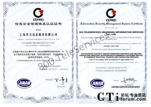 CTI論壇(ctiforum)1月31日消息(記者 浩宇):2012年1月,著名的服務(wù)外包呼叫中心和電子商務(wù)運營中心企業(yè)--飛翱集團旗下全資子公司上海華泛信息服務(wù)有限公司---,繼2009年獲得ISO9001 質(zhì)量管理體系國際認(rèn)證后。經(jīng)過半年嚴(yán)格的綜合考評,再次成功獲得又一由國際上公認(rèn)的ISO/IEC 27001:2005(也簡稱為:ISO27001)并獲得具有美國認(rèn)證機構(gòu)國家認(rèn)可委員會ANAB授予的雙重信息安全管理體系認(rèn)證。