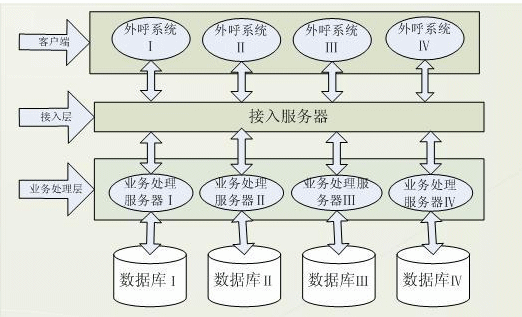 針對舊外呼業(yè)務(wù)系統(tǒng)的弊端及業(yè)務(wù)系統(tǒng)特點,賽迪呼叫研發(fā)了基于三層C/S結(jié)構(gòu)的外呼業(yè)務(wù)系統(tǒng),該系統(tǒng)分客戶端,接入服務(wù)器,業(yè)務(wù)服務(wù)器及數(shù)據(jù)庫端。客戶端發(fā)送請求給分配服務(wù)器,接受到請求后,分配服務(wù)器根據(jù)客戶端的請求數(shù)據(jù)將其分配給自身的業(yè)務(wù)服務(wù)器做業(yè)務(wù)處理,這樣客戶端與業(yè)務(wù)服務(wù)器建立起聯(lián)系,結(jié)構(gòu)體系如圖: