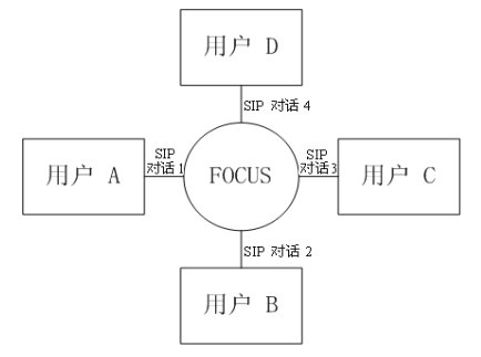 緊耦合會(huì)議的邏輯架構(gòu)圖如圖三所示。會(huì)議中的核心是“會(huì)議中心(conference focus)”,每一個(gè)會(huì)議都有一個(gè)會(huì)議中心,由一個(gè)URI標(biāo)識(shí),用戶通過(guò)聯(lián)系這個(gè)URI參加到一個(gè)會(huì)議中去。會(huì)議中心和用戶之間的拓?fù)浣Y(jié)構(gòu)為星性結(jié)構(gòu)。會(huì)議中心為用戶提供并維持一個(gè)信令連接,并且可以執(zhí)行會(huì)議策略,實(shí)現(xiàn)對(duì)會(huì)議的控制和管理。