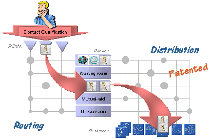CCD智能呼叫分配器對經(jīng)過呼叫特性鑒別并進(jìn)入引導(dǎo)系統(tǒng)的呼叫,通過路由選擇矩陣進(jìn)入不同的等待隊(duì)列,并由第二個(gè)雙向分配矩陣進(jìn)行資源選擇或呼叫選擇。CCD先進(jìn)的雙矩陣分配方式,通過其獨(dú)特的技巧和費(fèi)用最低的路由算法來管理呼叫業(yè)務(wù)和資源,其性能超過當(dāng)前工業(yè)標(biāo)準(zhǔn)。這種呼叫分配算法的顯著特點(diǎn)之一是恰到好處地分離路由選擇、資源分配以及選擇呼叫三個(gè)過程,使其既相對獨(dú)立,又靈活選擇。而傳統(tǒng)的“矢量分配”法的主要缺點(diǎn)是僅從呼叫的觀點(diǎn)描述處理,缺乏對正空閑的資源該做些什么加以控制。