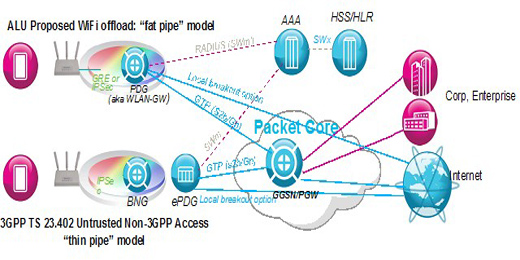 上述方案解決了WiFi分流的認(rèn)證問(wèn)題,上海貝爾的方案中,將WLAN的GW功能引入到7750 SR業(yè)務(wù)路由器上,該功能通過(guò)7750 SR上的AA-ISA多業(yè)務(wù)板卡實(shí)現(xiàn)。WiFi分流為確保安全性,在3GPP TS 23.402中,對(duì)WiFi終端的接入,采取了一種所謂瘦管道的模式,即要從用戶端向網(wǎng)關(guān)發(fā)起IP-Sec連接,而AP僅充當(dāng)橋的作用,對(duì)于PC或平板電腦等終端,這不是什么問(wèn)題,但對(duì)于手機(jī)而言,IP-Sec將帶來(lái)非常大的負(fù)荷,不僅影響終端上應(yīng)用的相應(yīng)速度,同時(shí)對(duì)電池的消耗非常之大,就目前情況看,市場(chǎng)上支持該功能的手機(jī)非常少。上海貝爾的方案中,采用了胖管道的模式,通過(guò)從AP向網(wǎng)關(guān)建立IP-Sec或GRE隧道,顯著降低了對(duì)移動(dòng)終端的要求,不僅使得移動(dòng)終端的成本得以下降,同時(shí)延長(zhǎng)了終端的使用時(shí)間,更重要的是,擴(kuò)大了運(yùn)營(yíng)商推廣WiFi 分流方案的適用群體。