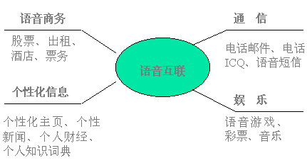 在中國,電話有著最廣泛的用戶群;追求方便時尚,希望使用互聯(lián)網(wǎng)信息、郵件而不懂或不熟悉鍵盤操作的用戶占4/5;語音互聯(lián)網(wǎng)是電話網(wǎng)與互聯(lián)網(wǎng)的完美結(jié)合,通過語音互聯(lián),普通電話用戶用自然語言對話的方式即可獲取互聯(lián)網(wǎng)的主要服務(wù),滿足用戶任何時間、任何地點(diǎn)、任何設(shè)備獲取信息的需求。在美國、日本,語音互聯(lián)已成為簡易終端接入互聯(lián)網(wǎng)的主要方式之一。