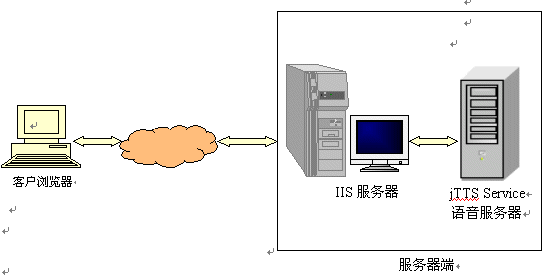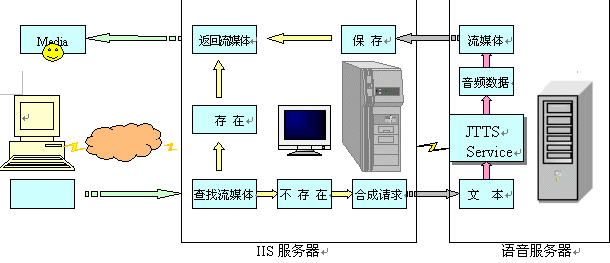 語音服務(wù)器方案是指利用捷通華聲在CTI領(lǐng)域成熟應(yīng)用的jTTS Service語音服務(wù)器,增加一臺或多臺語音服務(wù)器到現(xiàn)有的IIS服務(wù)系統(tǒng)的網(wǎng)絡(luò)環(huán)境中;在IIS服務(wù)器中,增加訪問語音服務(wù)器的功能。當(dāng)IIS服務(wù)器需要流媒體輸出時,向語音服務(wù)器發(fā)出請求,語音服務(wù)器接受IIS服務(wù)器的請求,并對請求的數(shù)據(jù)進行合成、格式轉(zhuǎn)換,得到流媒體后返回給IIS服務(wù)器,IIS服務(wù)器再將此流媒體傳輸給用戶。