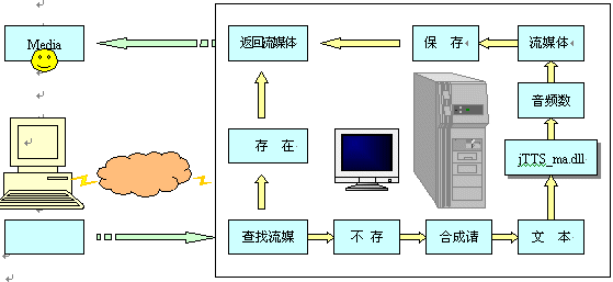 瀏覽器端(Explorer)發(fā)出瀏覽請求,網(wǎng)站服務(wù)器(IIS)根據(jù)請求查找流媒體(音頻流)文件,如有,則將流媒體返回客戶端,并啟動客戶端的MS media player播放流媒體。若沒有,則向語音服務(wù)器(jTTS Service)發(fā)出合成請求,并將所需合成的文本通過Socket接口傳送至語音服務(wù)器;語音服務(wù)器響應(yīng)網(wǎng)站服務(wù)器的合成請求后,將調(diào)用jTTS合成技術(shù)進行語音合成,并調(diào)用WMF SDK將生成的音頻文件轉(zhuǎn)換成流媒體格式ASF;通過Socket接口返回IIS服務(wù)器端后,將此流媒體文件存儲到指定的Web目錄,同時將流媒體返回瀏覽器端,啟動MS media player播放。其流程如下: