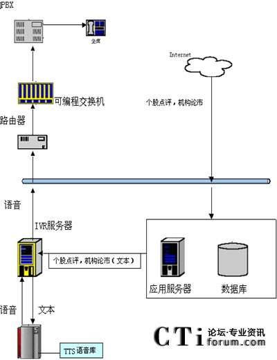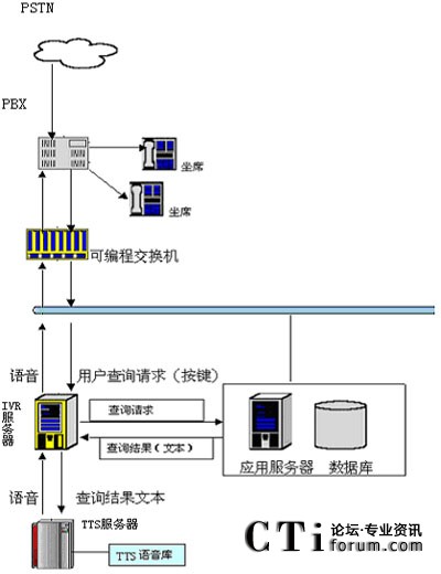 在技術(shù)上,用戶可以通過電話提交他的查詢請求(比如使用按鍵方式),IVR服務(wù)器收到請求后會向其他應(yīng)用服務(wù)器提交此查詢請求,當(dāng)IVR得到查詢結(jié)果后,他會將文本形式的查詢結(jié)果交給jTTS服務(wù)器,jTTS服務(wù)器會返回查詢結(jié)果的語音形式,最終語音會在坐席上播放,用戶就可以聽到他剛才所要查詢的信息。(如圖所示)