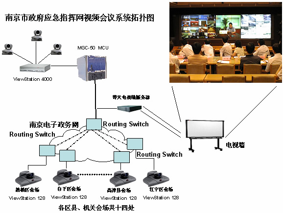 南京市政府利用南京市電子政務(wù)網(wǎng)的網(wǎng)絡(luò)基礎(chǔ),建立政府視頻會議指揮系統(tǒng),連接14個區(qū)縣政府及機關(guān),會議帶寬為768Kbps。利用本系統(tǒng)實現(xiàn)快速召集全市關(guān)鍵部門的會議。