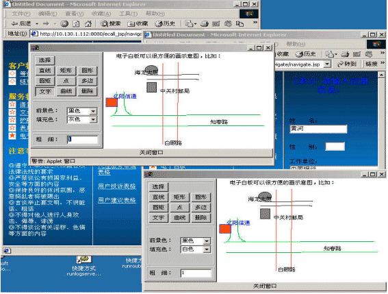 電子白板功能是在語音文字交談之外,ICWEB為用戶提供的圖形交談工具。電子白板允許多個在線用戶同時在界面里繪制刪除任意圖形,寫字、插入圖片以及用標志工具標示某些區(qū)域。電子白板功能可以有效地補充文本交談功能所不具備的圖示功能。