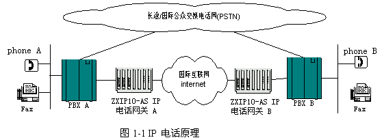 普通電話的基本流程是:用戶在phone A要打長途電話到phone B,語音從phone A到PBX A,通過PSTN網(wǎng),經(jīng)PBX B到phone B。而IP電話的基本流程為:用戶在phone A要打長途電話到phone B,語音經(jīng)PBX A傳到網(wǎng)關(guān)A。在網(wǎng)關(guān)A對語音進行處理,打成可在IP網(wǎng)絡傳輸?shù)恼Z音包。由IP網(wǎng)絡將語音包傳給網(wǎng)關(guān)B,網(wǎng)關(guān)B對語音包進行處理,還原為語音,經(jīng)PBX B傳到phone B。IP 電話原理見圖1-1。