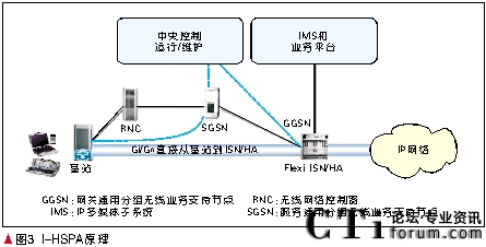 Mb/s為例,一個1 500個扇區(qū)的HSDPA網(wǎng)絡(luò)所產(chǎn)生的數(shù)據(jù)量為21.6 Gb/s。目前業(yè)界RNC的數(shù)據(jù)吞吐量僅達(dá)到1 Gb/s。今天各運營商建設(shè)的3G網(wǎng)絡(luò)與2G共用核心網(wǎng),其帶寬和數(shù)據(jù)處理能力遠(yuǎn)遠(yuǎn)不能滿足HSPA高數(shù)據(jù)率的需求。當(dāng)數(shù)據(jù)負(fù)荷激增時運營商將面對RNC/SGSN的擴(kuò)容的巨大壓力。此外在每一個節(jié)點處對數(shù)據(jù)包的重新拆裝會導(dǎo)致在每一節(jié)點都要引入額外的時延。結(jié)果會產(chǎn)生較長的網(wǎng)絡(luò)時延。對于移動互聯(lián)網(wǎng)應(yīng)用,這種多層次的網(wǎng)絡(luò)結(jié)構(gòu)是沒有必要的。使網(wǎng)絡(luò)扁平化不僅可以簡化設(shè)備降低成本,還可以減少時延。I-HSPA應(yīng)運而生。這種架構(gòu)把基站通過Gi/Gn口直接連接到GGSN節(jié)點(通向互聯(lián)網(wǎng)和數(shù)據(jù)業(yè)務(wù)的網(wǎng)關(guān))[5]。I-HSPA原理如圖3所示。