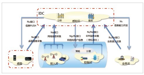 中興通訊增強端到端信息感知和開放接口,提出一套標準架構如圖2所示,來實現(xiàn)整個網(wǎng)絡透明、可視。建設網(wǎng)絡信息采集體系,增強感知云的端到端分析能力;建立“桌面云-感知云”的云端一體化架構,提供網(wǎng)絡推送能力;感知云向終端開放網(wǎng)絡信息和能力,增強用戶感知網(wǎng)絡、定制個人體驗能力;感知云向業(yè)務開放網(wǎng)絡信息和能力,拓展合作發(fā)展增值業(yè)務的能力。