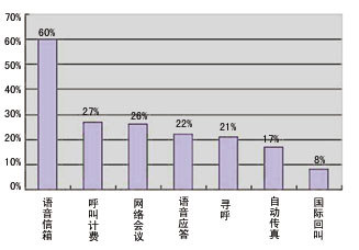 從企業(yè)所使用的CTI應(yīng)用服務(wù)來看:最多的是語音信箱(Voice Mail)為 60%。呼叫計(jì)費(fèi)(Call Accounting)為27%,網(wǎng)絡(luò)會(huì)議(Conferencing)為26%。語音應(yīng)答(IVR)為22%。由于CTI在我們國家,這一兩年才得到比較快的發(fā)展,所以應(yīng)用層次還不是很高。還有一個(gè)原因是有些CTI技術(shù)的應(yīng)用在發(fā)展企業(yè)的核心業(yè)務(wù)方面作用不大,所以像Audio TEX、Powers Dialers等一些應(yīng)用就比較少。