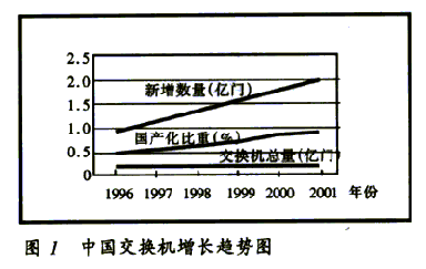 2000年,中國公用通信網(wǎng)上局用程控交換機(jī)的總?cè)萘窟_(dá)到1.79億門,國內(nèi)生產(chǎn)設(shè)備的比重達(dá)80%。預(yù)計2001年新增交換機(jī)容量2100萬門,總?cè)萘窟_(dá)到2億門,國內(nèi)生產(chǎn)設(shè)備的比重超過85%,增長趨勢見圖1。