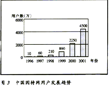 據(jù)CNNIC統(tǒng)計的數(shù)據(jù)表明,到2000年12月31日止,中國的因特網(wǎng)用戶達(dá)到2250萬戶,上網(wǎng)計算機(jī)892萬臺,預(yù)計2001年中國將有超過4500萬的網(wǎng)民。中國域名總數(shù)為12.2萬個,WWW站點(diǎn)數(shù)26.54萬個。中國因特網(wǎng)的發(fā)展速度驚人,與國際因特網(wǎng)的發(fā)展速度相當(dāng)。中國因特網(wǎng)用戶發(fā)展趨勢見圖3。