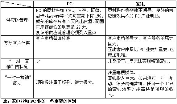 聯(lián)想長期構(gòu)筑的、在中國PC制造業(yè)的核心競爭力,正受到戴爾的巨大威脅,導(dǎo)致聯(lián)想開始轉(zhuǎn)而采用戴爾的按客戶需求定制、直接銷售的模式,希望建立新的核心競爭力,再度引領(lǐng)中國PC產(chǎn)業(yè)。IT制造業(yè)的巨變,戴爾的成功給陷于低層次競爭的家電產(chǎn)業(yè)很大的啟發(fā),曾經(jīng)鑄造中國家電企業(yè)輝煌的核心競爭力急需注入新的生命力,以適應(yīng)新的競爭形勢。計算機技術(shù)、互動通信技術(shù)的進步以及互聯(lián)網(wǎng)的出現(xiàn)使企業(yè)能夠建立與用戶之間一對一的密切客戶關(guān)系,使服務(wù)創(chuàng)造價值,IT技術(shù)推動技術(shù)、產(chǎn)品、生產(chǎn)、銷售和營銷的發(fā)展,支撐家電企業(yè)建立新的核心競爭力。在同質(zhì)化競爭的環(huán)境下,家電企業(yè)也許更應(yīng)該從服務(wù)、營銷、銷售方面來建立自己的核心競爭力。海爾就是典型的例子,海爾的發(fā)展與它完善的服務(wù)體系和服務(wù)制度是分不開的。聚焦于服務(wù)、營銷、銷售的客戶關(guān)系管理(CRM)系統(tǒng)讓家電企業(yè)看到了新的希望?梢灶A(yù)言,CRM將為家電業(yè)點燃一盞新啟航燈。