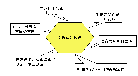 企業(yè)實施電話銷售成功與否,與幾個關鍵要素有關系,我稱它們?yōu)殡娫掍N售的關鍵成功因素,如下圖: