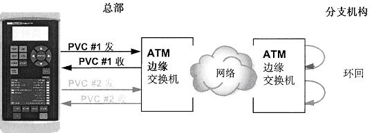 第二,在PVC通道的遠(yuǎn)端設(shè)置物理或虛環(huán)路,這樣單獨(dú)一臺測試儀可同時作為流量的發(fā)送者和接收者(見圖2)。 圖2、環(huán)回測試設(shè)置,涉及中心局和遠(yuǎn)端局的PVCs端口