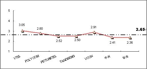 為深入了解和對(duì)比被調(diào)查者對(duì)不同品牌視頻會(huì)議終端系統(tǒng)產(chǎn)品的認(rèn)知程度,本次調(diào)查將被調(diào)查者對(duì)各主要品牌的了解程度劃分為五個(gè)檔次,對(duì)不同的檔次賦予不同的分值,分別為“非常了解(5分)”、“了解(4分)”、“一般(3分)”、“不了解(2分)”、 “非常不了解(0分)”,同時(shí)綜合考慮以購(gòu)買(mǎi)用戶擁有的品牌分布,借以比較不同品牌在認(rèn)知度上的差異。統(tǒng)計(jì)結(jié)果顯示,目前在中國(guó)市場(chǎng)上,用戶對(duì)主要視頻會(huì)議終端系統(tǒng)產(chǎn)品品牌的了解程度的平均值為2.65,各品牌認(rèn)知度分值見(jiàn)圖6。其中:VTEL品牌的知名度最高,指標(biāo)值為3.05,超過(guò)了“一般”了解水平;其次為VCON品牌,指標(biāo)值為2.91;POLYCOM的知名度指標(biāo)值為2.8,處于第三位。除VTEL品牌外,其他主要品牌的知名度還都處于低于“一般”了解水平階段,反映出產(chǎn)品的市場(chǎng)認(rèn)知還較低。