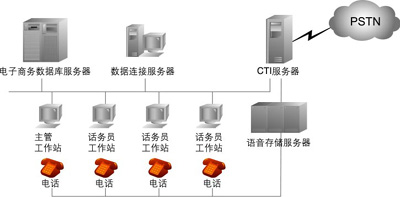 中型呼叫中心:座席代表在50~100之間。據(jù)專(zhuān)業(yè)數(shù)據(jù)統(tǒng)計(jì)公司預(yù)測(cè),中型系統(tǒng)需求量最大,因此不少呼叫中心軟、硬件開(kāi)發(fā)商對(duì)準(zhǔn)這一目標(biāo)進(jìn)行開(kāi)發(fā)。這種系統(tǒng)結(jié)構(gòu)相對(duì)簡(jiǎn)單,投資也少,容易被中、小企業(yè)所接受。目前我國(guó)的一些公司開(kāi)發(fā)系統(tǒng)多屬于此種類(lèi)型。它可以省掉大型交換機(jī)的投資,而利用PBX與CTI服務(wù)器和業(yè)務(wù)代表座席直接相連,業(yè)務(wù)代表席同時(shí)與應(yīng)用服務(wù)器相連,客戶資料也存在應(yīng)用服務(wù)器中,可實(shí)時(shí)地將接入電話的客戶姓名自動(dòng)在計(jì)算機(jī)屏幕上彈出。CTI服務(wù)器一般由CTI硬件開(kāi)發(fā)商的板卡和PC組成,其擴(kuò)容和增加功能也比較方便,成本也低,因此是一種投資小、見(jiàn)效快、升級(jí)也很靈活的系統(tǒng)。